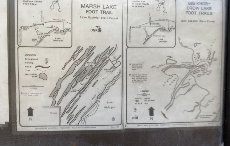From the intersection of US-2 and M-117 just south of Engadine, head west 1.5 miles to Big Knob Road and turn south (left). Follow the signs to the Big Knob State Forest Campground 6 miles down the dirt road. Here you will find the Crow Lake, Big Knob, and Marsh Lake Pathways and State Forest Campground. A recreation passport is required for entry and one can be purchased at the self-guided kiosk if necessary.